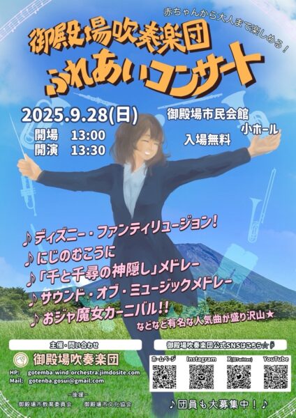 御殿場吹奏楽団の秋の恒例ふれあいコンサートが、10月28日(日)に御殿場市民会館 小ホールで開催されます。